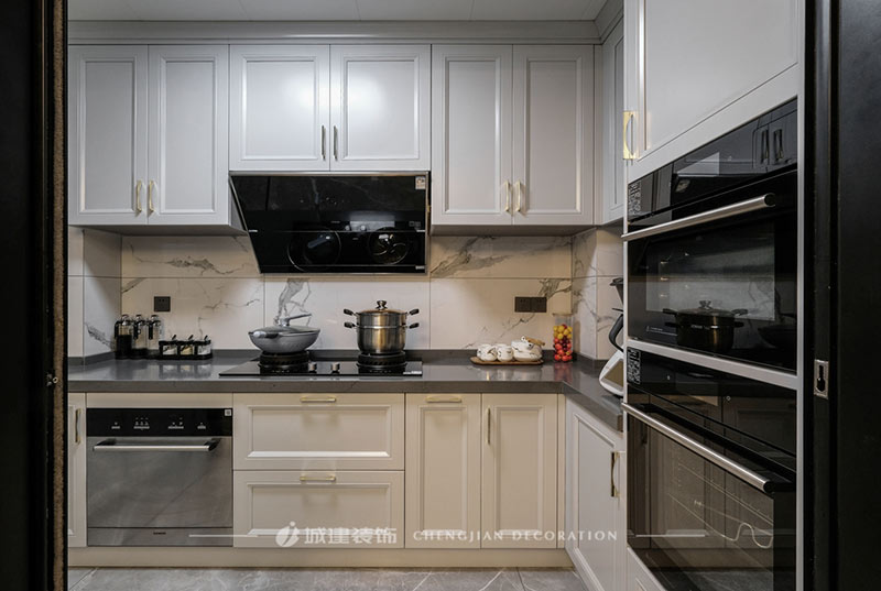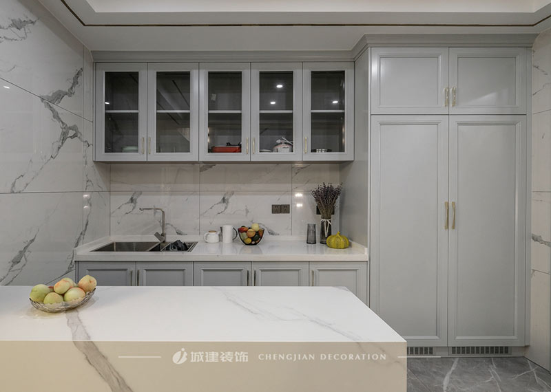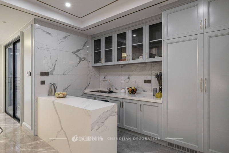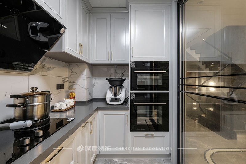 穿過客廳,看到的是面對(duì)樓梯的開放式西廚區(qū),它緩解了大空間的視覺疲勞,營造空間層次感;