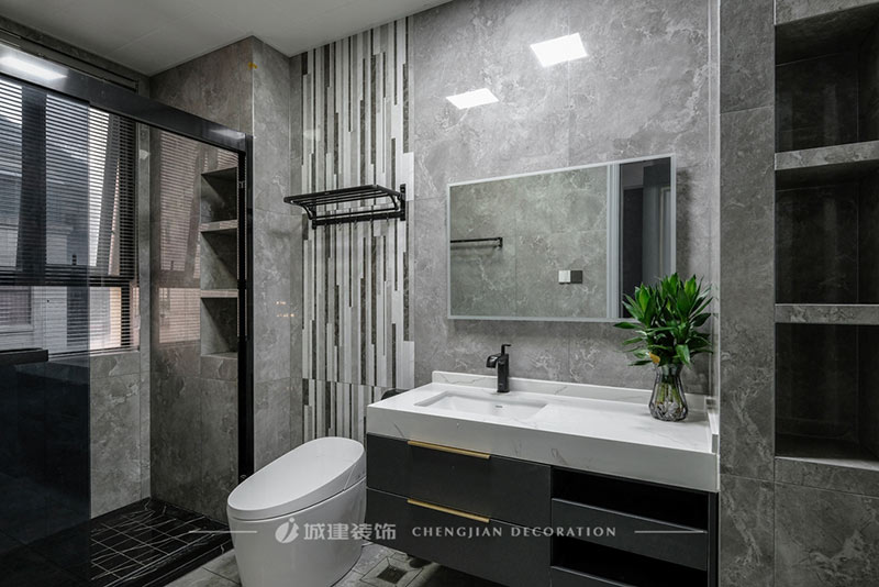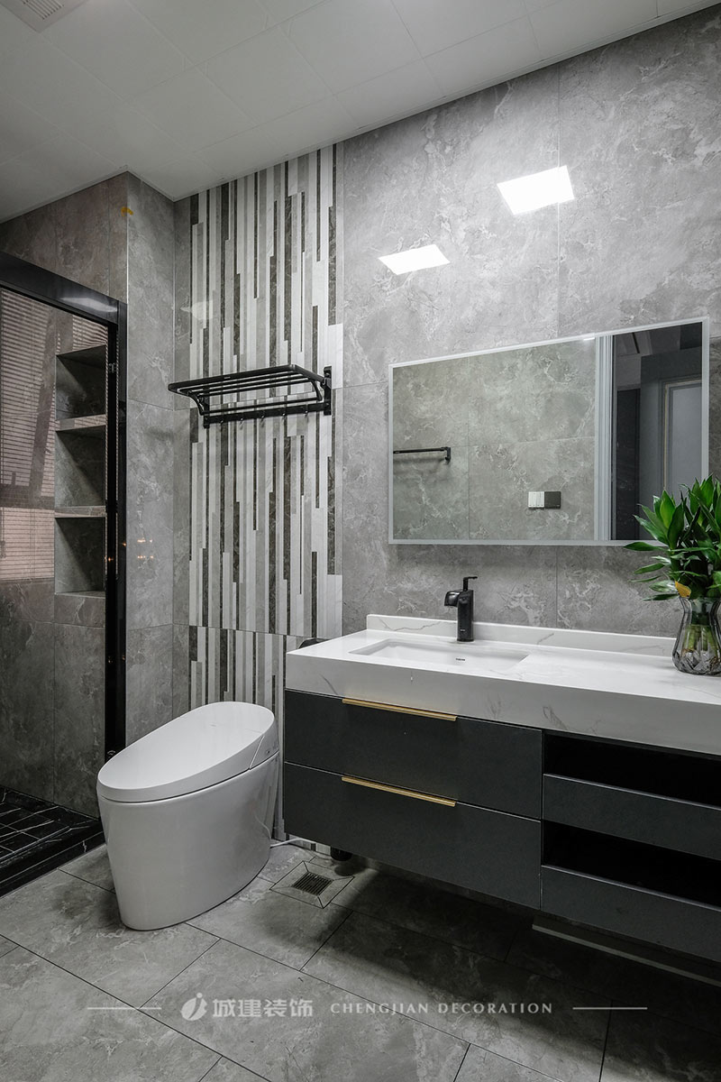 衛(wèi)生間依然延續(xù)灰色主基調(diào),空間黑灰白的經(jīng)典搭配簡潔大氣,質(zhì)感滿滿。