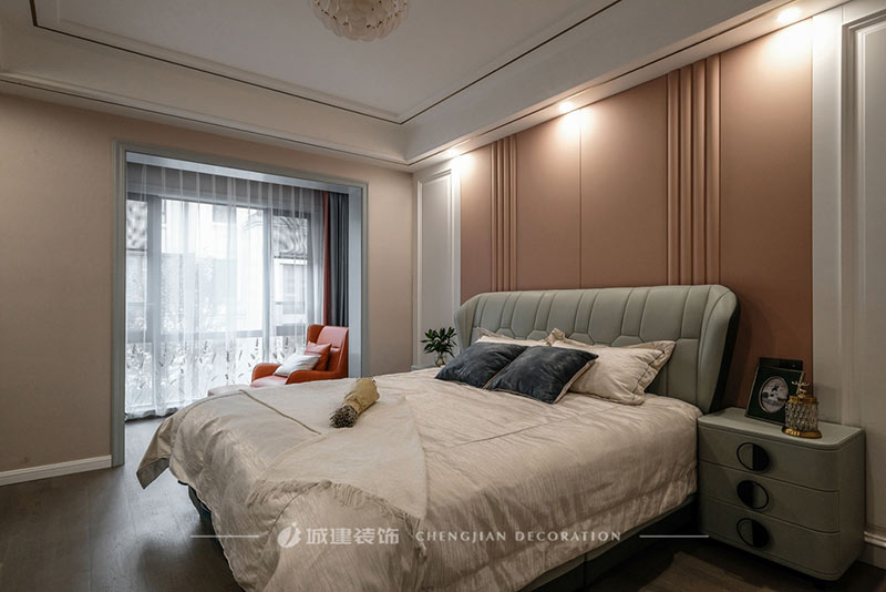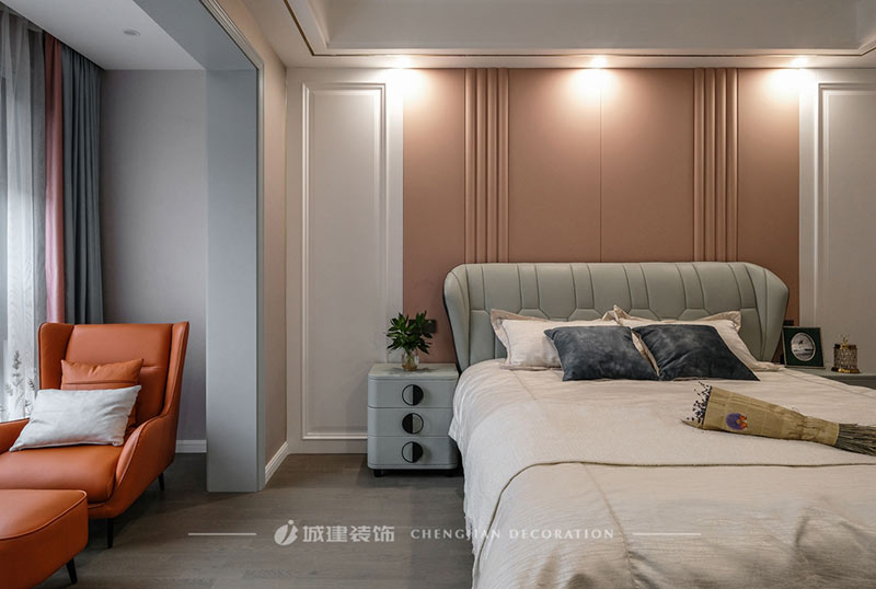 女兒房,選擇溫柔的粉色系,簡潔的直角走邊吊頂用細(xì)金屬條裝飾,床頭射燈營造溫馨氛圍,整個(gè)空間青春靚麗。