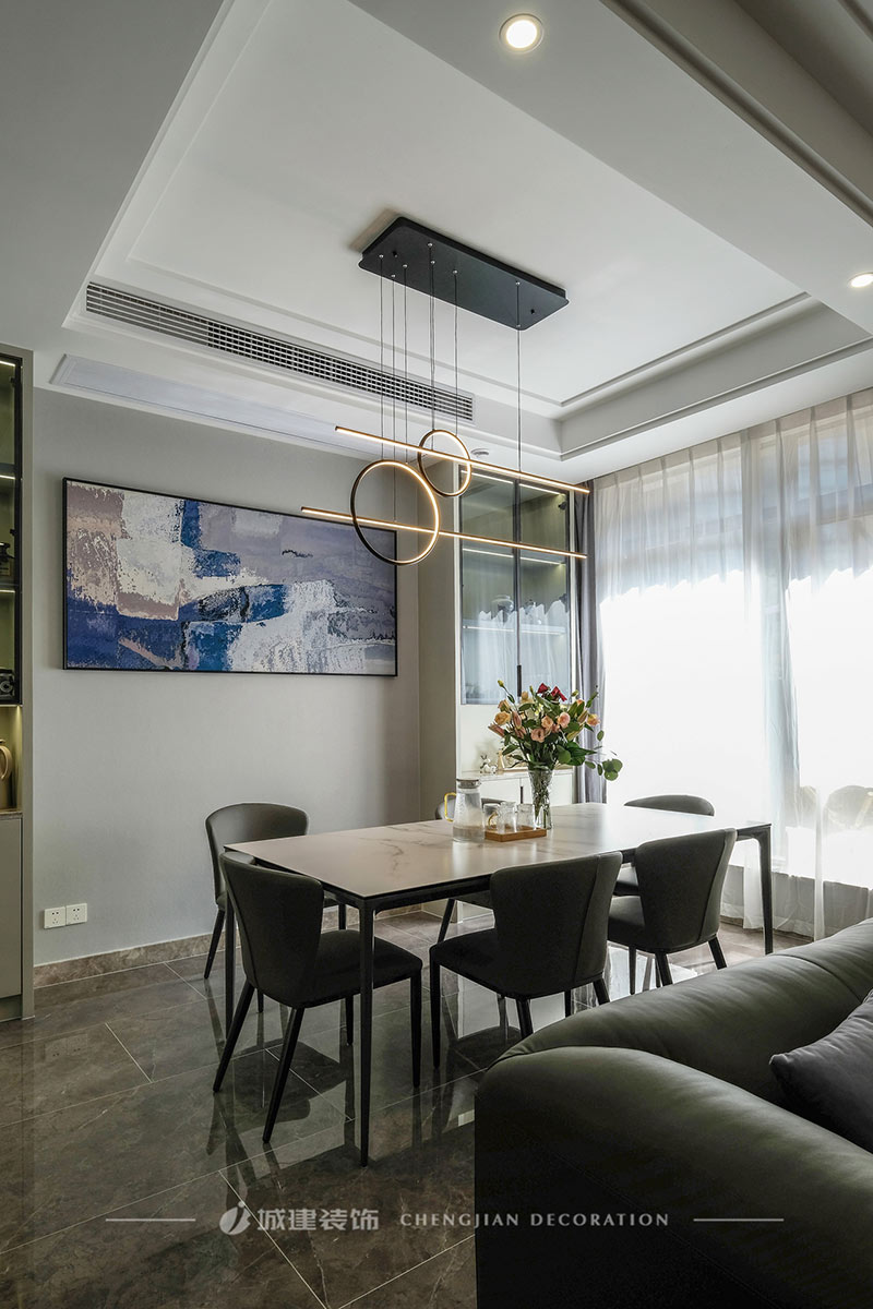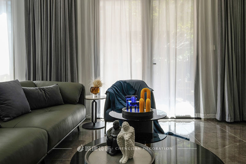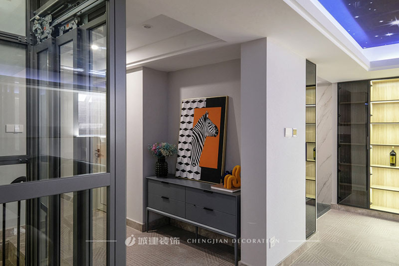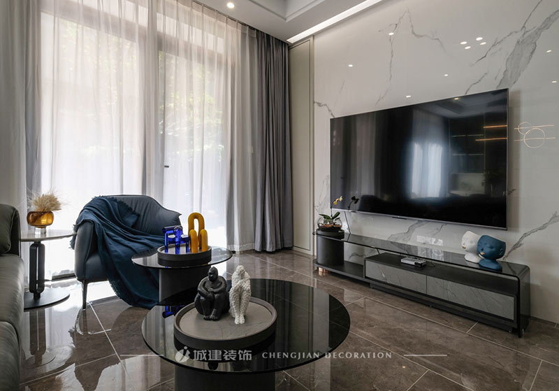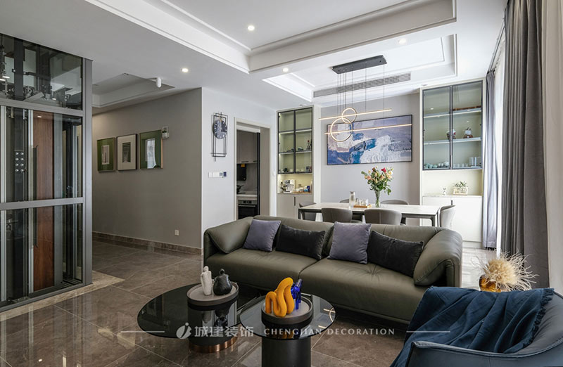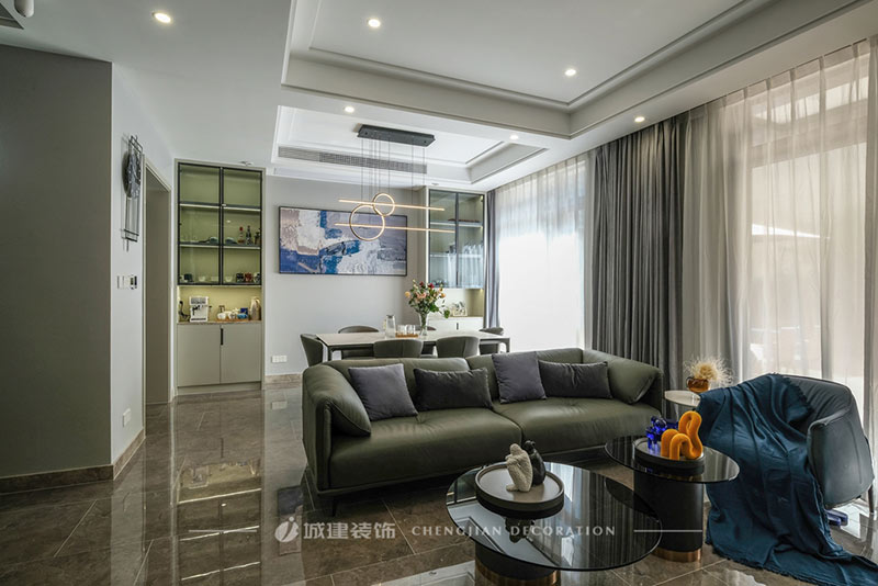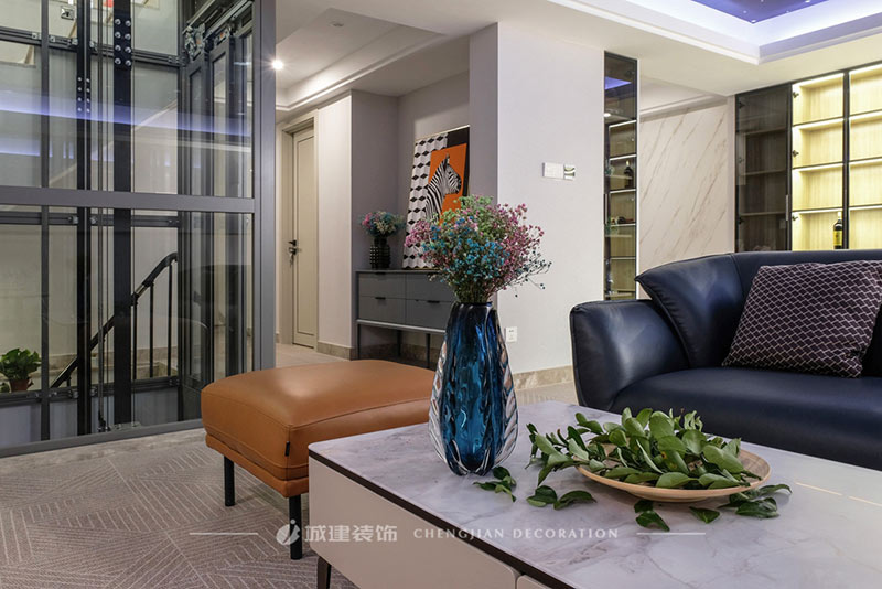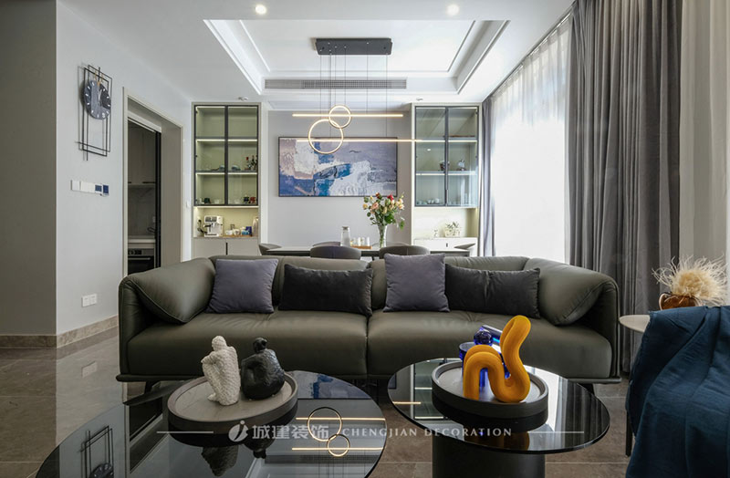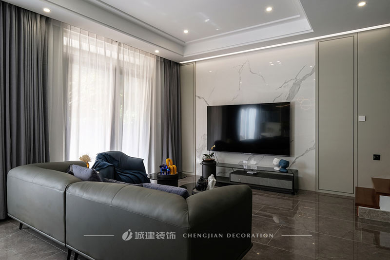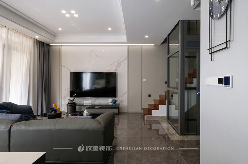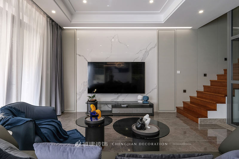 客廳自上而下,從白色吊頂?shù)脚疑珘γ妫俚酵ㄤ伒纳钌撩娴卮u,色彩由淺漸深,不厚重,空間氣質(zhì)簡約大氣;