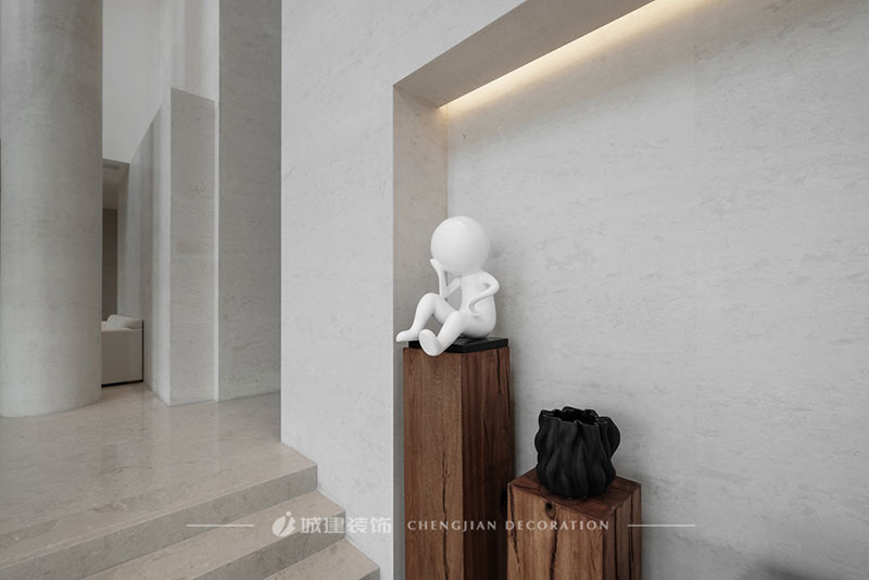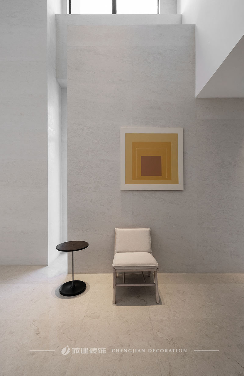 隱藏式暖色光源傾灑在石材面上,讓挑空的大空間不冰冷。