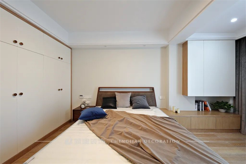 一體化的地臺(tái)床設(shè)計(jì)讓臥室看起來(lái)更寬敞,也更具整體性,它將床頭柜與床,甚至背景墻融為一體,降低居室的重心,將空間利用極致,帶給居住者滿滿的安全感。