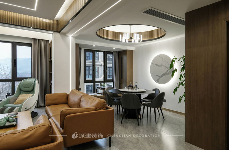 餐廳選擇圓餐桌,設(shè)計圓吊頂,家人親朋圍坐,圓融、圓滿,這是中國文化中一種美好的期望。
