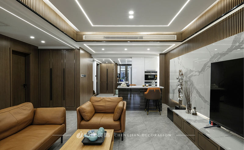 加上木格柵電視背景墻兩側(cè)做了圓弧的設(shè)計,仿佛是展開的一枚竹簡,