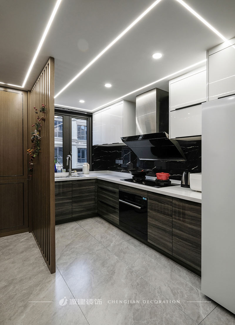 因為空間的限制,廚房做成開放式,玄關(guān)區(qū)與廚房之間僅以格柵隔開,