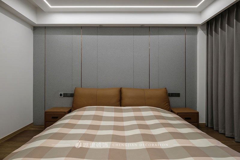 主臥以質(zhì)感灰硬包背景墻碰撞黃棕色的家具,營造靜謐溫柔的休息氛圍,金屬裝飾條的鑲嵌,提亮現(xiàn)代風(fēng)格臥室的輕奢感。