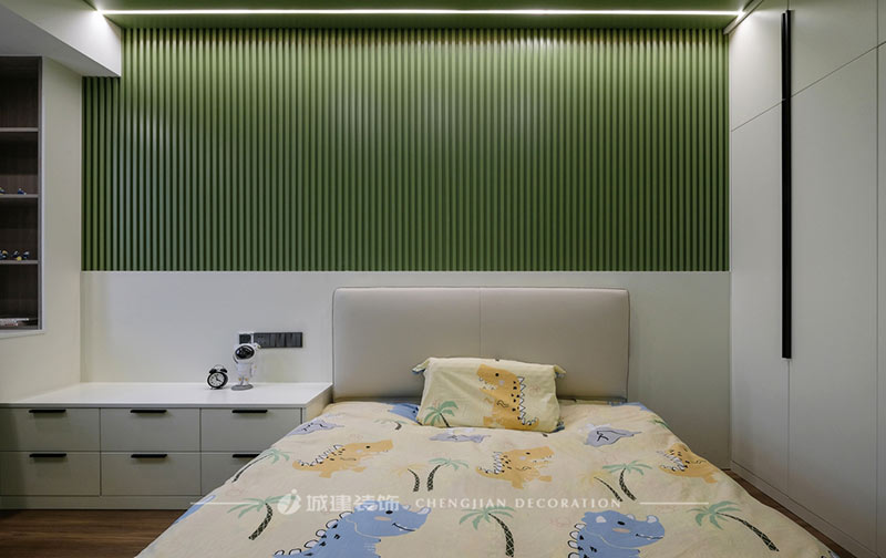 兒童房選擇青草綠的格柵設(shè)計,燈光打在上面,就像春日的陽光灑在一片青青的草地,勃勃生機(jī);